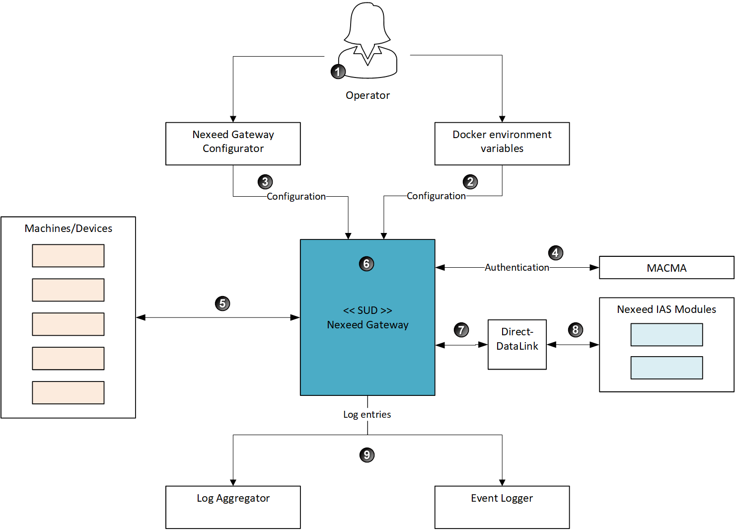 The interface <5> between stations and the Gateway module is bidirectional. The process communication must be started from a station. When the Gateway module receives a request message from a station <8>, Gateway makes it easier to forward this request message to external Nexeed Industrial Application System services based on the specified configuration. Forwarding takes place via the DirectDataLink <7> module.